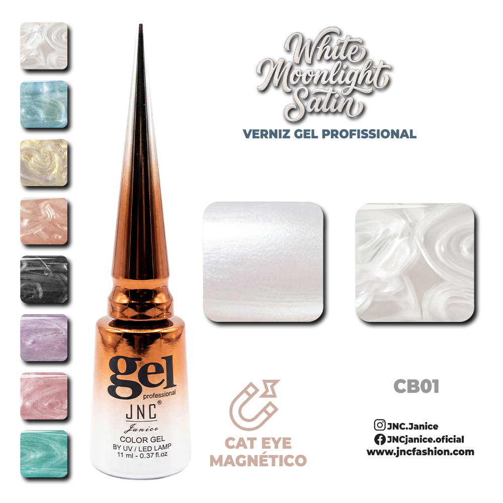 O JNC White Moonlight Satin é um verniz gel profissional com efeito magnético, que proporciona um acabamento acetinado delicado com reflexos luminosos inspirados no brilho suave da luz da lua.