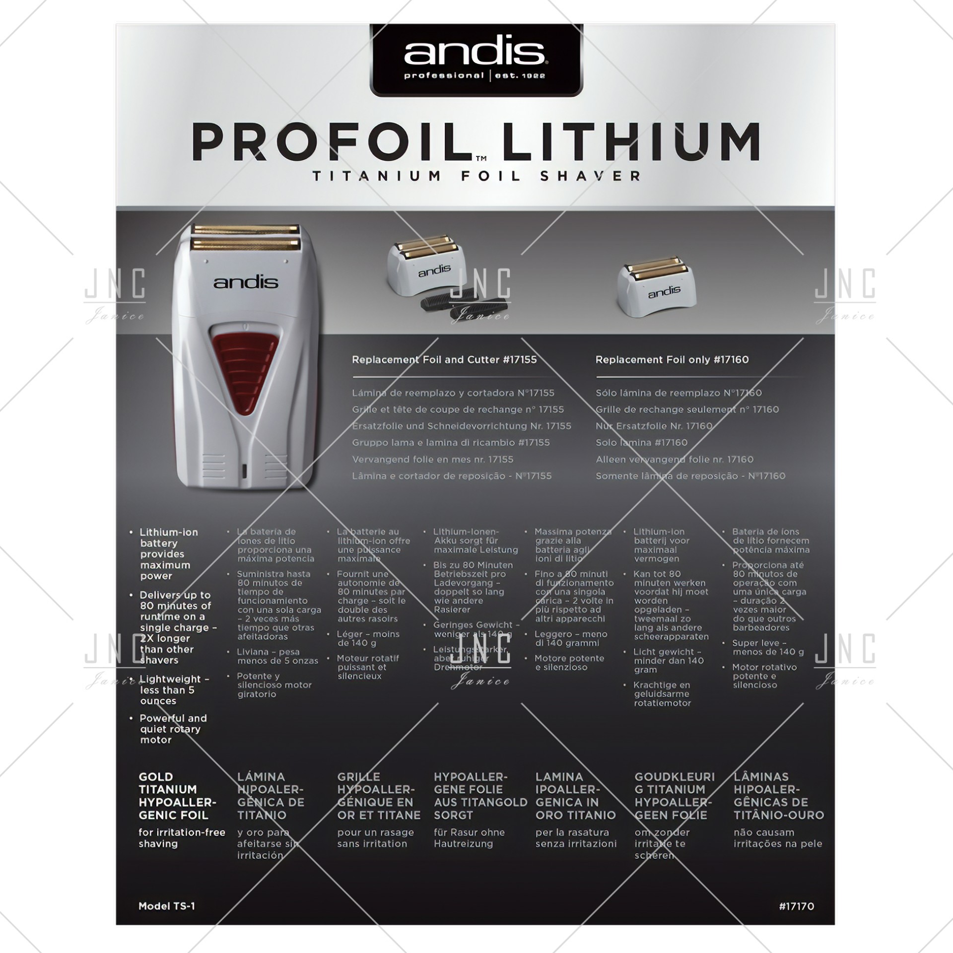 Home Máquinas de Corte Máquina Andis Barbeador de folha de titânio e lítio ProFoil | REF.A17170 Máquina Andis Barbeador de folha de titânio e lítio ProFoil | REF.A17170 SKU: A17170 128,47 € Desconto de %. IVA incluído. Compre este produto e ganhe 128 Pontos! Comprar Contactar Adicionar à wishlist Máquina Andis Barbeador de folha de titânio e lítio ProFoil A bateria de íon de lítio fornece energia máxima. Oferece mais de 1 hora de tempo de execução com uma única carga - duas vezes mais que outros barbeadores. Leve - menos de 5 onças. Motor rotativo potente e silencioso. Folha hipoalergênica em titânio dourado para barbear sem irritação. Marca Andis Partilhar