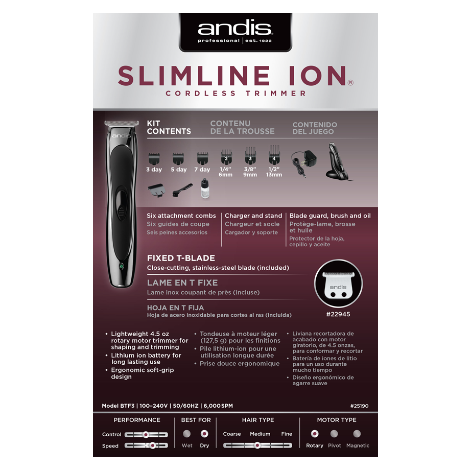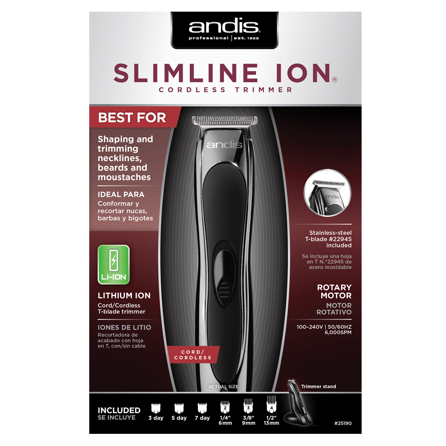 Home Máquinas de Corte Máquina Andis Slimline Ion | Ref.238953 Máquina Andis Slimline Ion | Ref.238953 SKU: 238953 135,30 € Desconto de %. IVA incluído. Compre este produto e ganhe 135 Pontos! Comprar Contactar Adicionar à wishlist Máquina Andis Slimline® Ion Lithium Ion Cord/Cordless Trimmer Ideal para Retoques & Contornos mais detalhados Design ergonómico e ultra leve Motor rotativo de alta velocidade (5000 rpm) Bateria de Ion de litio c/ autonomia para 2 horas Equipada com lámina T em ago inoxidável Marca Andis Partilhar