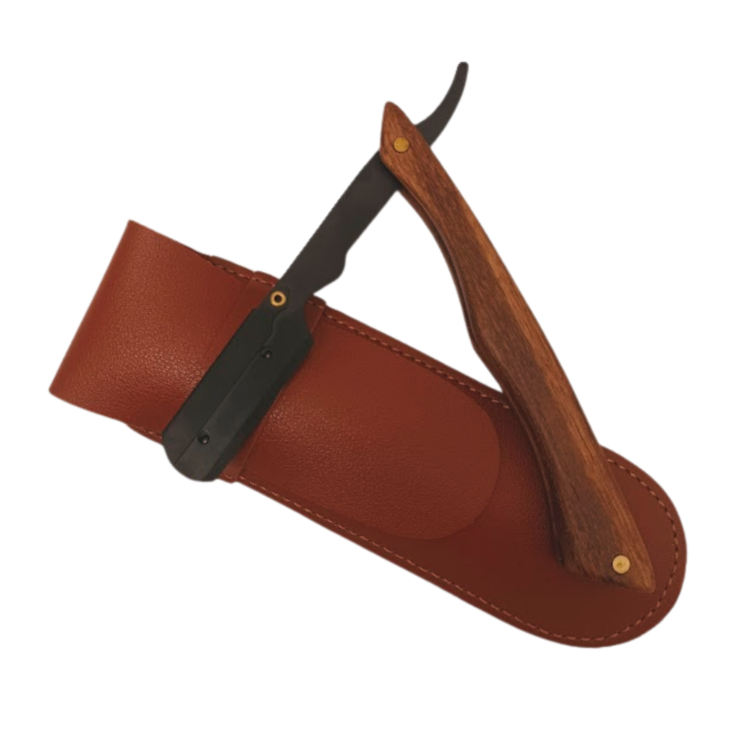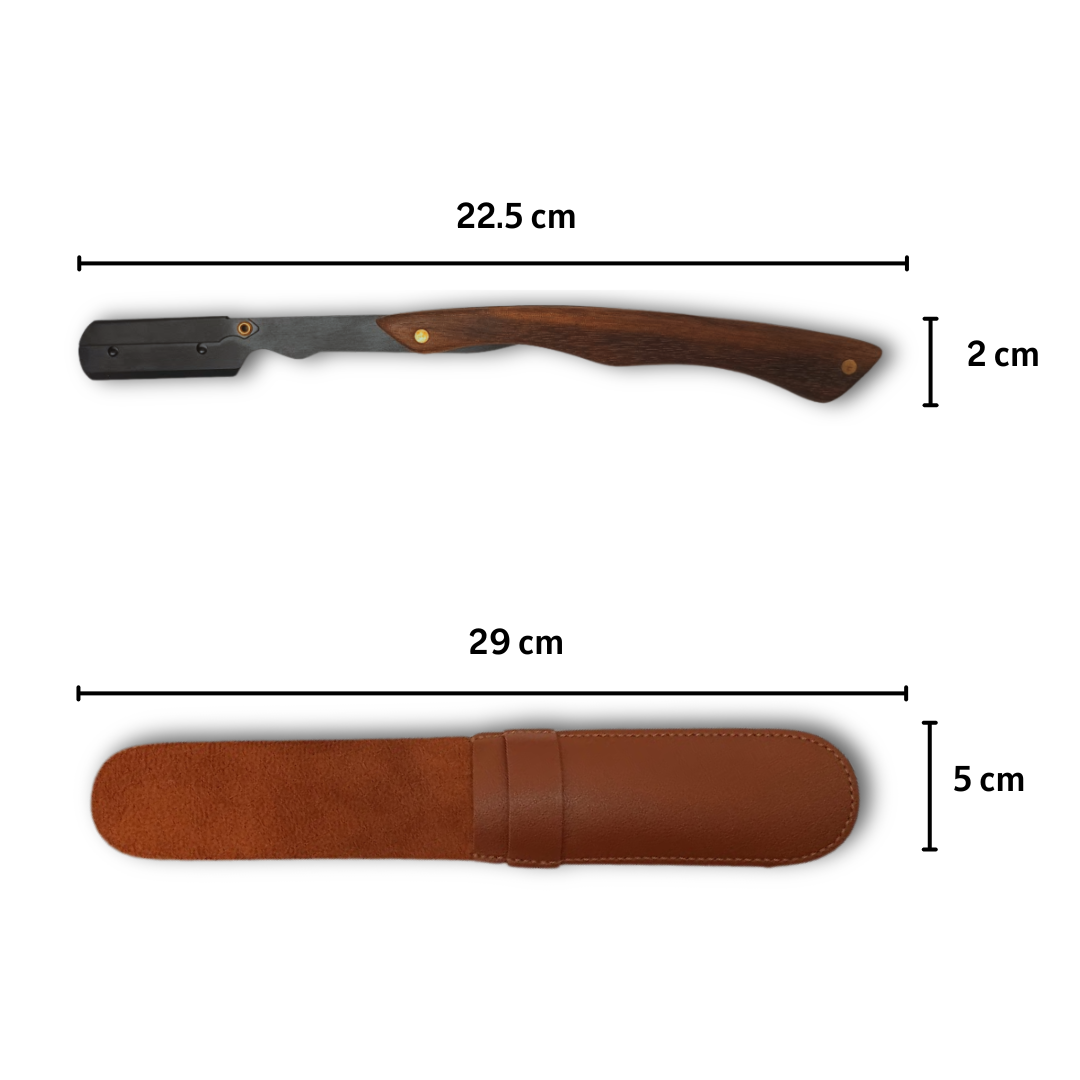 O cabo em madeira resistente proporciona uma pegada confortável e segura, enquanto a capa em couro permite guardar e transportar a navalha com proteção e estilo.