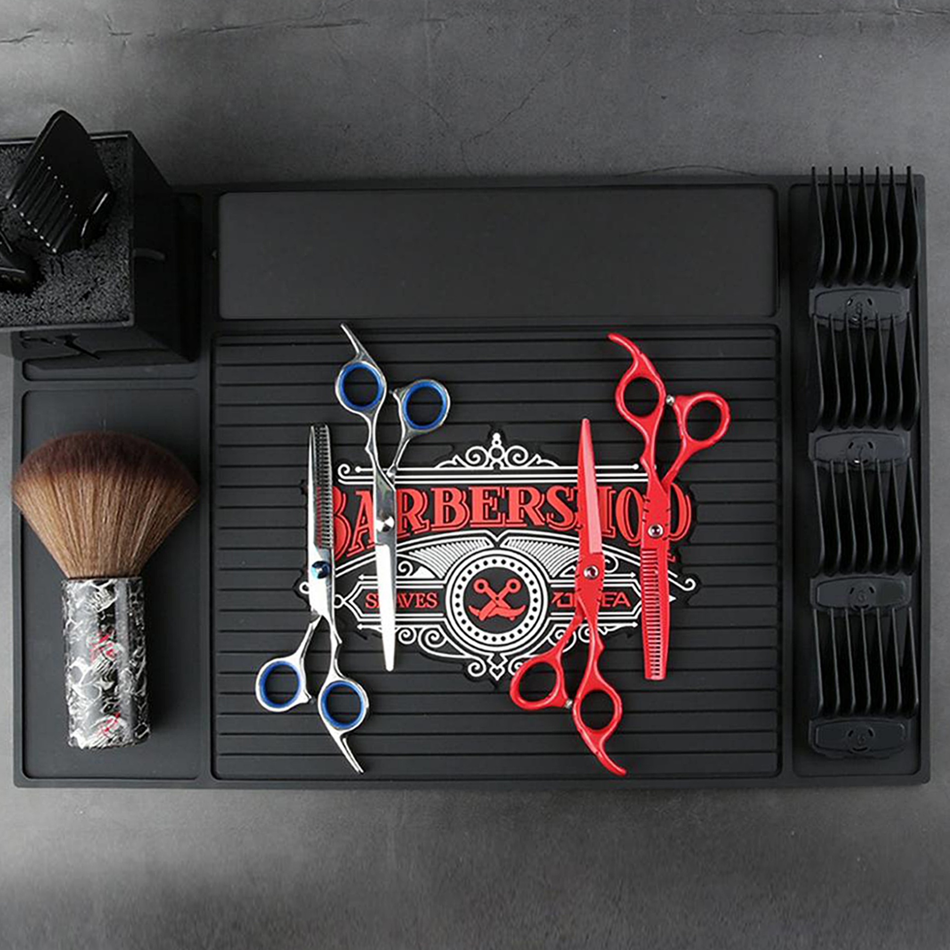 - Com compartimento de tamanho diferente para ferramentas, a superfície Nonslip mantém ferramentas de barbeiro no lugar e organizadas